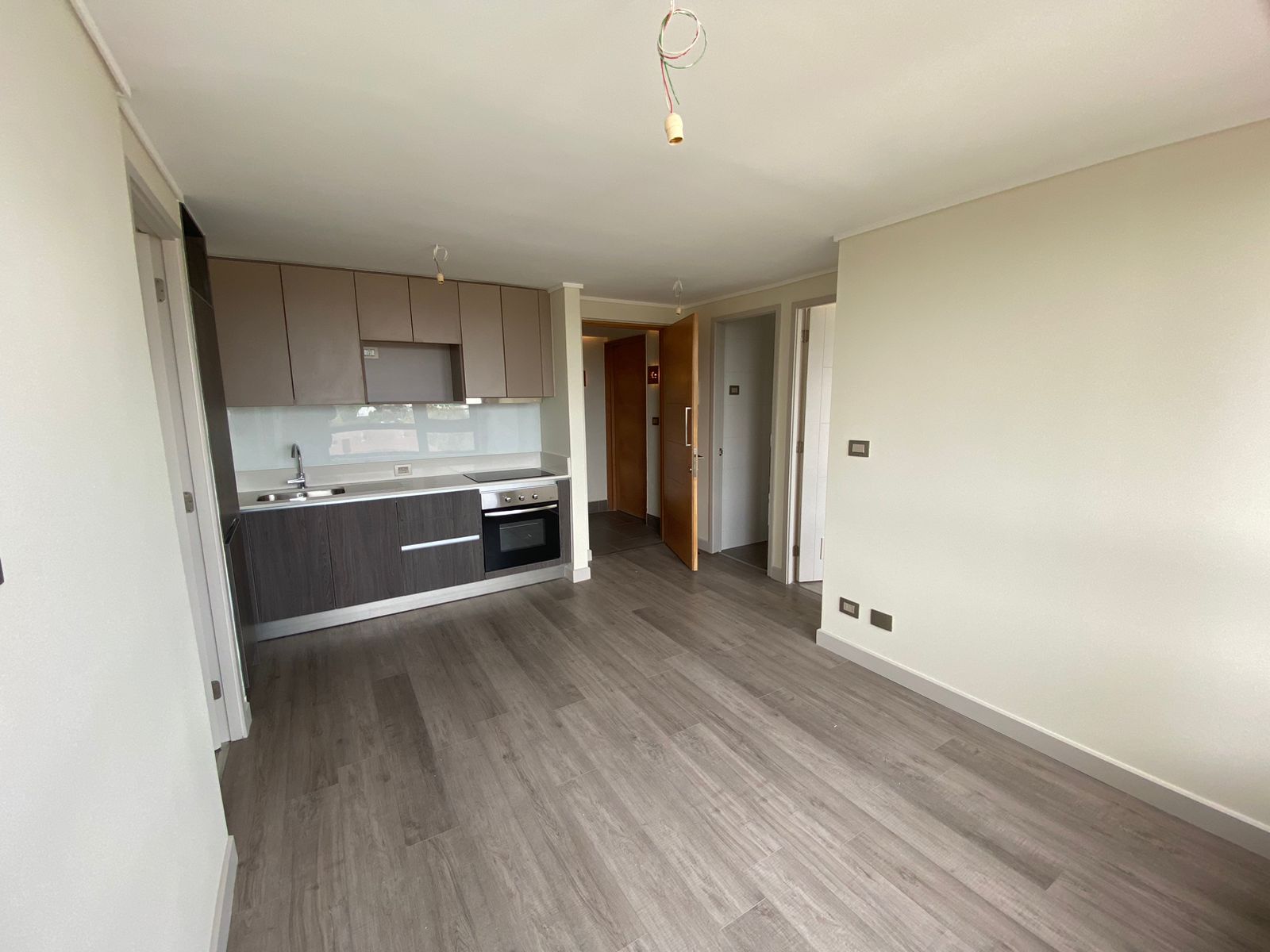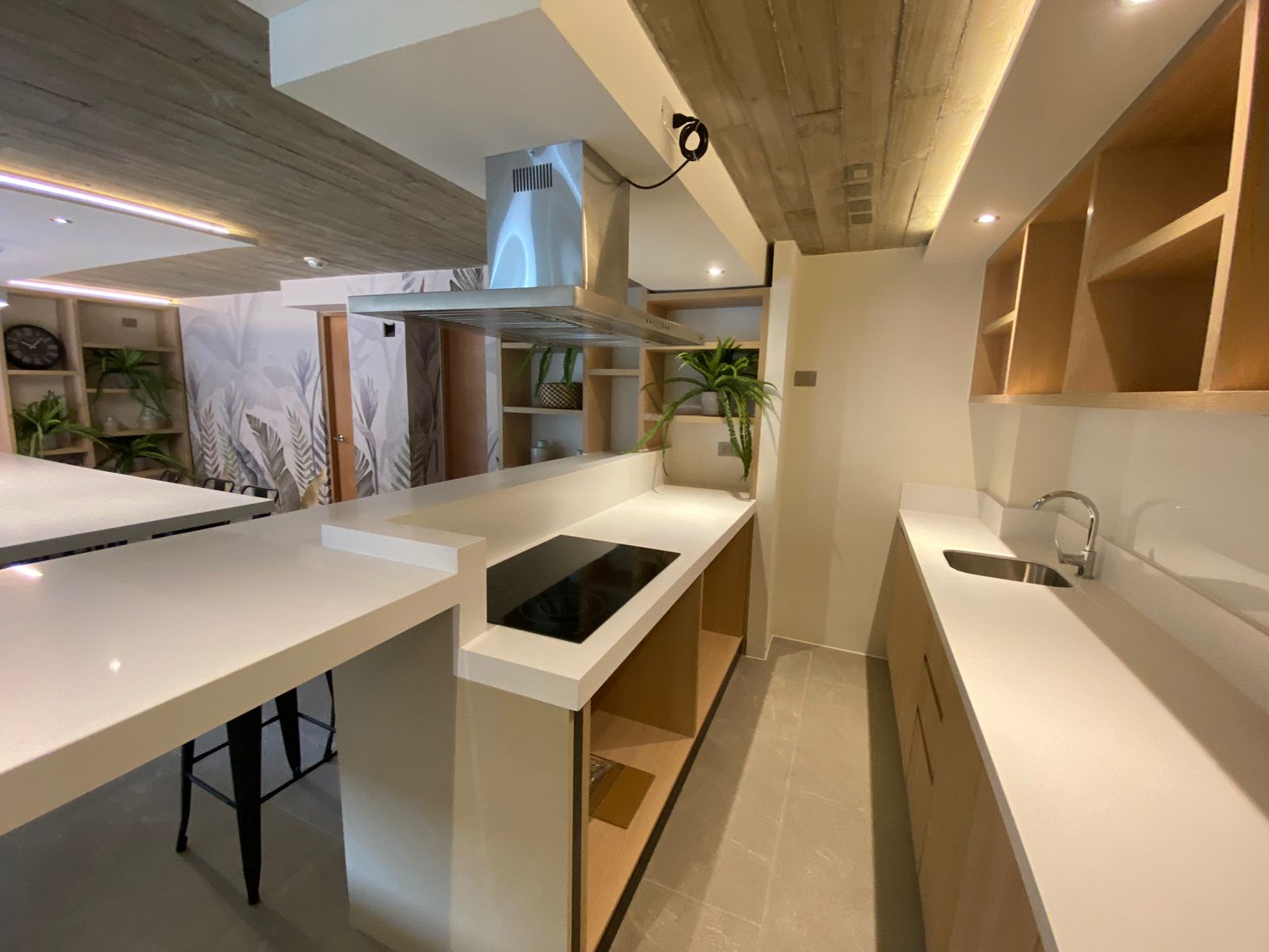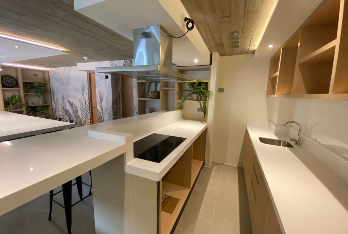 🔺Living comedor con cocina concepto abierto. Terminaciones de cocina con cubierta de quartztone, equipada con encimera vitrocerámica, horno y campana. Refrigerador panelable.